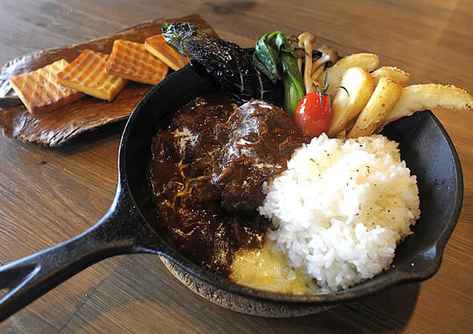 アウトドア料理がメインのグリル&カフェというスタイルで、その豪快な料理は本格的なもの。量、質ともにハラペコのバイカーを充分満足させる内容である。室内には本格的なマキストーブが置かれ実際に活用されていて、温かいご馳走を食べながら過ごす時間は実にゆったりと寛げるものだった。