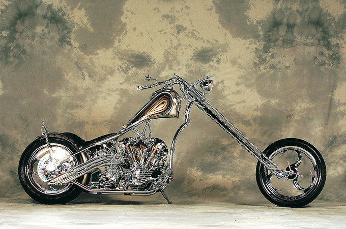 87ciにスープアップされた41ナックルを懐に抱えるロングフォークチョッパー。これぞワイルドロードの真骨頂とも言える一台、その美しさたるや! ワンオフにて製作された22インチオーバーのツイステッドスプリングフォーク。フレームはこのフォークに合わせて上方にストレッチ、シングルダウンチューブとされる。寸分の隙もない徹底した造り込みはアートの域に達している。しかし、走りに対しての妥協は一切ない。オーナー/植村紘也