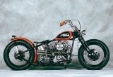 古き良き時代を彷彿させるスタンダードなチョッパー。リジッドフレームにミディアムエイプハンガー、キング&クイーンシート、ピーナッツタンクのセットアップはいつの時代も色褪せないことを再認識する。4mmステンの角棒で製作したオイルタンク後方のバッテリーボックスとチェーンガードが一番苦労した箇所だと言う。オーナー/上原健史