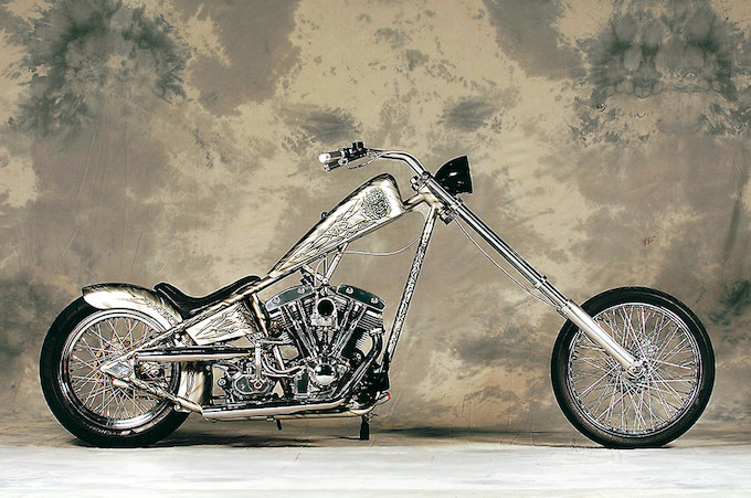鹿児島のゴールデンスミスによるニュースクールチョッパー。ツーリングに楽しいバイクをコンセプトに製作。最もこだわったと言うペイントワークは必見。同じく鹿児島のKILLIFISHが手掛けたトライバルを基調としたシルバーメタリックのエアブラシ。外装を始めフレーム、オイルタンクと徹底したペイントがマシンの完成度を高めている。オーナー/大薗 勝