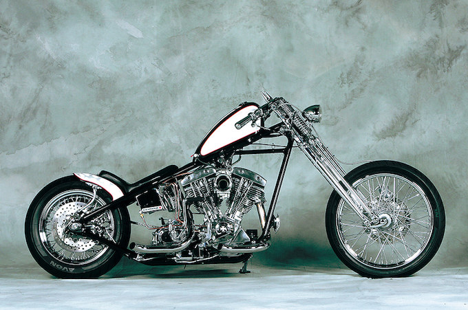 セパハン風バーがスタイリッシュなランズの75 FL。3インチストレッチされたステムに8インチオーバーのスプリングフォーク。タンク/リアフェンダーはスチール製ワンオフ。タンクのマウント位置とハンドルバーのシンクロにより、何とも言えないスタイリングを実現。各部にクロームが施されたワンオフパーツが惜しげもなく奢られている。オーナー/内藤ヨシノリ