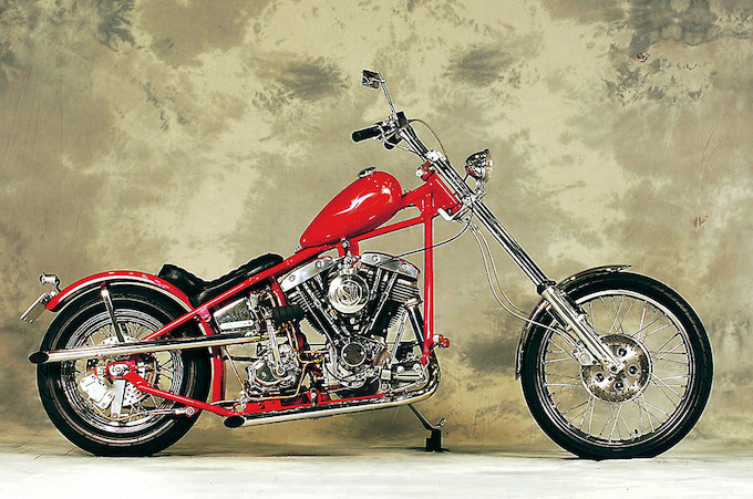 サンティフレームには大きなストレッチを施さず、8インチオーバーの35mmナローフォークをセットすることでフロント上がりの60年代風チョッパーとされた76ショベル。ナローマスタングにはパールのフレイムスがさりげなくペイントされている。エンジンはフルストック、キャブはSU。銅管によるオイルラインの処理も見逃せない。オーナー/椚原 聡