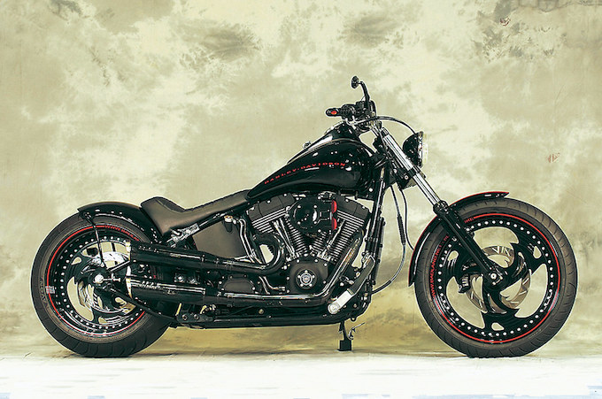 ソフテイルフレームをベースに攻撃的かつバランス良く仕上げた01ナイトトレイン。前後ホイールにリックス製H.LECTOR、マフラーはASインダストリーを、リアタイヤに300ワイドを装着。エンジンカラーに合わせ全体をブラックに統一し、ホイールリムに入るレッドのピンラインがアクセントに。ハンドルのZバーが個性だ。オーナー/田渕雄大