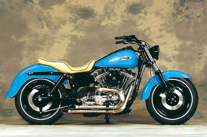 鮮やかなボンネビルブルーにペイントされた05 FXDC。ショベル4速フレーム風ストリップというマニアックなコンセプトが与えられている。モーターはストック、キャブのみHSR45に換装されている。前後フェンダーはファットボーイ用を加工、シートはワンオフ製。ステンレスのSUS LAKE HEADERSマフラーが見物だ。オーナー/伊藤大亮