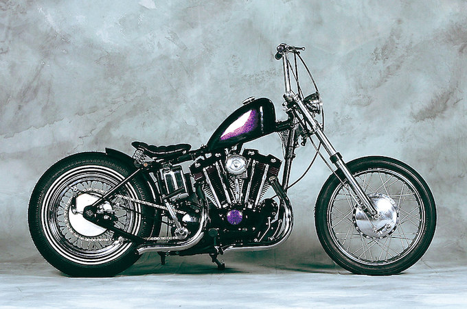 ストックフレームにTT&CO.オリジナルのボルトオンショートハードテイルをセット、コンパクトなチョッパーとなった71XLCH。So-Calバーにスポーツタンク、ワンオフのショートエキゾーストが好バランスだ。外装のキャンディパープルとエンジンにもパープルを使い、どこかミステリアスながらもポップなマシンに仕上がった。オーナー/YAMANISHI