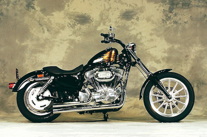 07モデルのXL883Lをベースに製作された意欲作。ビルダー曰く、新たに開発したインジェクション対応の2.25ガロンタンクが見所。サンティのマフラーや4インチ伸ばしたフロントエンドもポイントだが、最大の見所はソリッドブラックの上に描かれたゴールドフレイムス。アーティスティックな雰囲気を醸すペイントワークだ。オーナー/大木弘泰