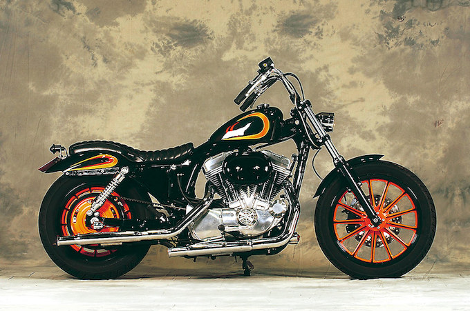 06 XL883をベースにしたストリートチョッパー。2.25ガロンタンク/FRPフェンダー/シートでアウトラインを構成し、ワンオフのハンドル&オイルタンク、ブレンボのブレーキやモーターステージ製マフラーなどでディテイルを煮詰めている。フィニッシュはお得意のペイント。骨格には手を入れないでストックのイメージを払拭することに成功している。オーナー/小川泰三
