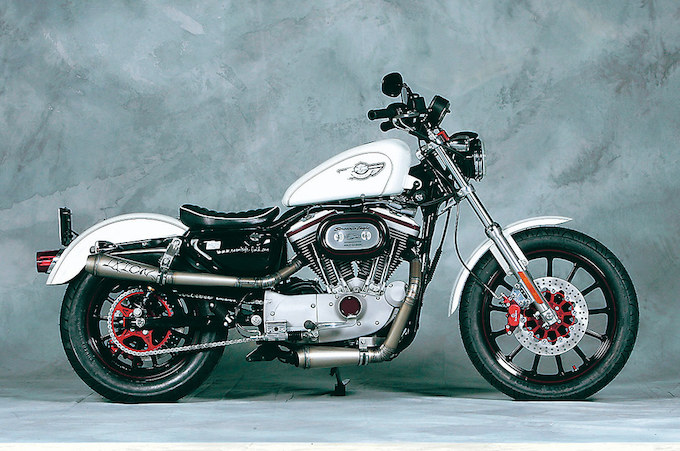 「レーシーながら街乗りもツーリングも楽しいハーレー」という欲張りなコンセプトの下、このマシンを製作したのはRS HIROHASHIのトライク以外のカスタム部門、ハイフィールド。前後ブレンボキャリパーやワンオフチタンマフラーがアクセントとなるが、ノーマルパーツを上手く使うことで走り、ルックス共にバランスの優れた一台に仕上がっている。オーナー/佐山光義