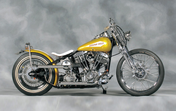 MOONのデモバイクがコチラ。代表の菅沼氏の愛車である。名付けて「BANANA GOLD」。ストックスタイルのフューエルタンクにサイクルフェンダー装備のスタンダードなチョッパーながらも、各部にMOONオリジナルパーツを散りばめ個性を発揮。シート、テールランプ、バレルタイプのオイルタンクなどがそれである。イエローゴールド&ホワイトのカラーリングがSO-CALの風を感じさせる1台だ。オーナー/SHIGE SUGANUMA