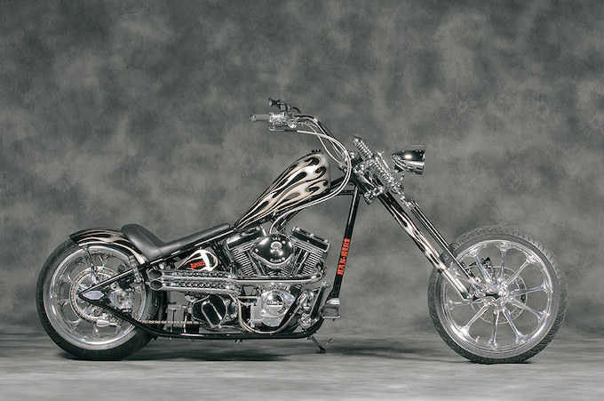 イージーライダースの07BOSSLEY ECR。リジッドのオリジナルフレームには迫力のドラゴンスプリンガーがセットされている。リアレッグにはエクステリアと同じ、シルバーのトライバルフレイムスをペイント。マフラーで隠れてしまっているが、ティアドロップオイルタンクもこだわりのディテイルである。押しの強いスタイリングだが、かなり乗りやすいとは、製作者の弁。オーナー/富山 満