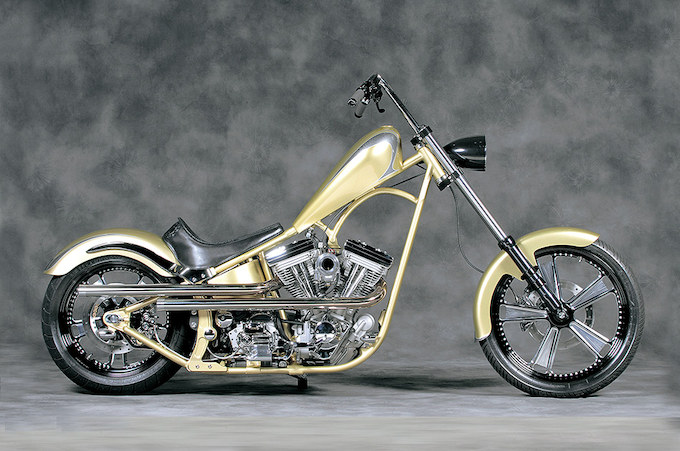 「日本人が乗った時に美しいカスタム」をテーマに製作された96FXSTC。ネック部がストレッチされたストックフレームに、セリアーニ製43mmのフロントフォークを適正なディメンションで装着すべくトリプルツリーをワンメイク。前後ホイールやハンドル周り、ブレーキシステムはPMで統一コーディネイト。クランクにはジムズのストローカーがインストールされ1460ccにスープアップされている。オーナー/柳光浩