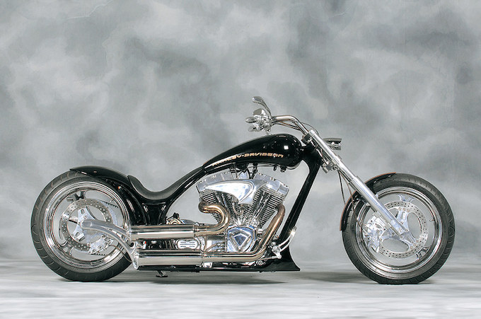 独国、THUNDER BIKEのコンプリートマシン。ブラック&ゴールドのカラーリングと各部のクロームがマッチしたクリーンなカスタムだ。シート部がラウンドした美しいフレームがこのマシンのキモ。大幅にストレッチされたフレームのような派手さはないが、均整の取れた優美なスタイリングはこのフレームの恩恵によるところが大きい。フューエルタンクからシート、リアフェンダーへの流れは絶妙である。オーナー/SAGIYA