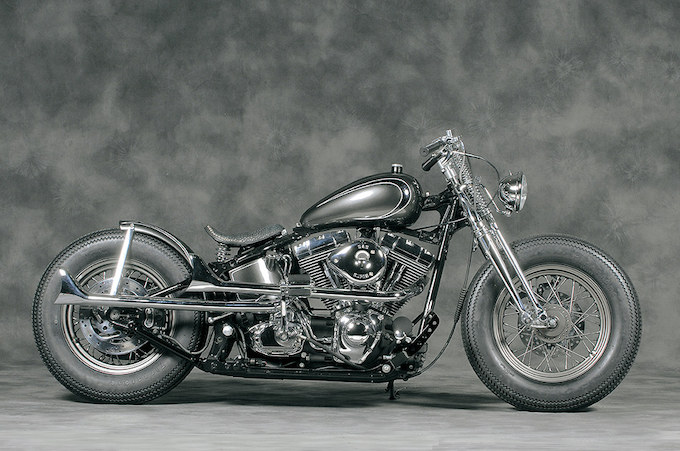 元々は事故車の修理に入ってきた03スプリンガーソフテイル。高価なパーツは使わないことを前提にカスタムは進行された。純正フレームをコンパクトに見せるべく前後16インチホイールにワンオフタンクをローマウント。視覚的効果の高いヘッドライト位置も同じくステム部付近に調整。個性となるフィッシュテールマフラーがマシンの完成度を高めるのに一役買っている。オーナー/SATO