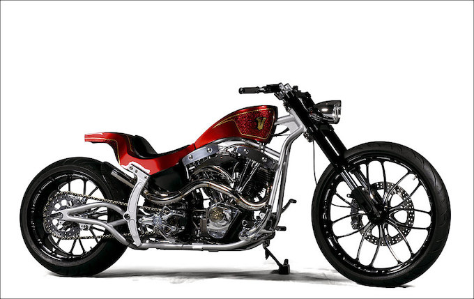VANQUISH(征服する)と名付けられた1979FXSはタンク、フェンダーに注力し製作。一枚の板から鈑金溶接して仕上げられたフォルムはハンドメイドならではの有機的な形状にフィニッシュ。あえて溶接跡を残したマフラーは左右2本出しで、スイングアームもアスタリスクにより手曲げで製作されている。シート下には容量3.9Lのオイルタンクとバッテリーを内蔵。非常にクリーンに仕上げられた一台である。オーナー/阿部政勝