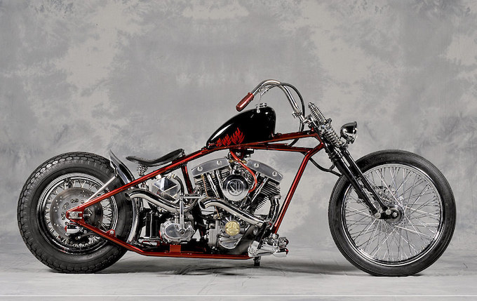 1974FXEをベースにジャパンドラッグテイストで仕上げられたディガー。ロー&ロングのスタイリングを要にフレームワークでオリジナリティを追求している。リアアクスルの内側から取り回されたフェンダーステーや極太のケーブルカバーなどトリッキーなアイデアが散りばめられている。オーナー自らがペイントを施したというキャンディレッドのフレームとブラックタンクのコントラストが鮮烈な印象である。オーナー/YAMAMOTO