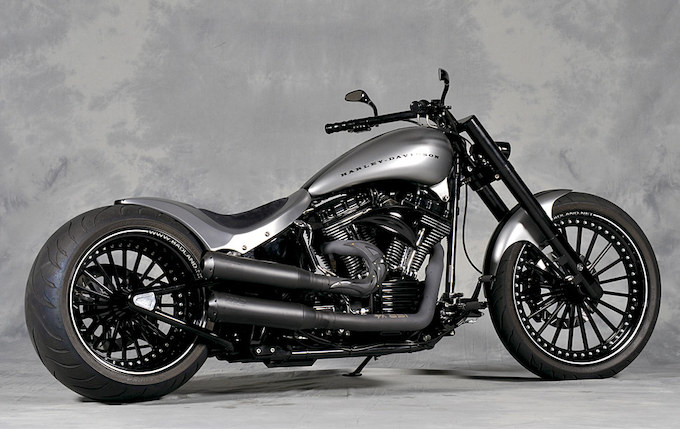 マットシルバー&ブラックのカラーリングがソリッドな印象を与える2008ナイトトレインカスタム。このマシンのこだわりはリアエンドに尽きるだろう。最新式のRick’s Motorcycles社製のリア3次ドライブ方式のワイドタイヤキットがインストールされている。その他にもフロントフォークやホイールなどにハイパフォーマンスパーツが装着された贅沢な仕様のバッドランドならではのカスタムマシンである。オーナー/SUZUKI