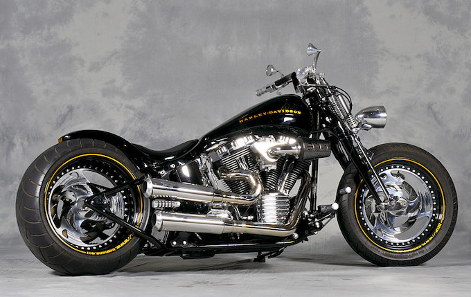 ストックのソフテイルフレームをベースにスプリングフォークを装着し典型的なユーロスタイルを狙ったというこのマシン。ベースは03年式のナイトトレインであるが、その面影はどこにも見受けられない。。戦闘的なボッバースタイルを入手するために、独国THUNDER BIKE社にスプリングフォークのローダウンを依頼したという。ユーロパーツに精通するバッドランドならではのコネクションの賜物と言える。オーナー/森田善則