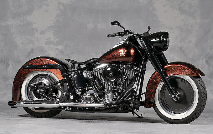 しっとりとしたイメージのキャンディルートビアで彩られた2003年式ファットボーイ。ブラックアウトされた前後ホイールやフォーク&ナセル、ハンドルバーなどと、外装のカラーリングのマッチングに高いセンスを感じさせる。ホワイトリボンのタイヤもイイ雰囲気だ。非常にシンプルに仕上げられているが、緻密な計算により時間をかけて徹底的に煮詰められたモーターロックの代表作と言える出来である。オーナー/渡部直樹