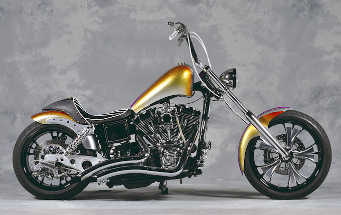 2005年式のFXDWGをベースとし大胆にモディファイが加えられた一台である。ワンオフ製作のフューエルタンクにシート、リアフェンダーが個性的なフォルムを形成している。キャンディ&フレイクのカラーリングとシートのホワイトパイピング&スタッズも見逃せないディテイルと言える。スロッテッドが施されたアルミビレットの極太スイングアームと同じテイストのフェンダーストラットの調和にも注目して欲しい。オーナー/ISHII