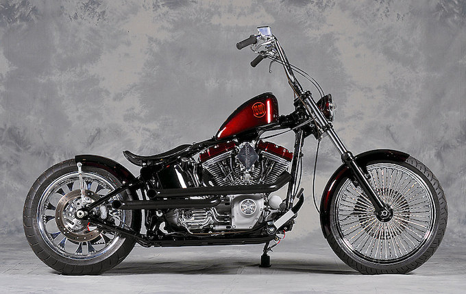 トータルでのバランスに細心の注意が払われているという2008年式ソフテイル・スタンダード。フレームにはまったく手を加えず、エクステリアのカスタムのみでスリムに製作されている。外装のブラウンメタリックに合わせてペイントされたロッカーカバーがアクセントとなっている点もポイントだ。ツイステッドスポークのフロントホイールとリアのビレットホイールの組み合わせも非常に面白いものだ。オーナー/KAWASAKI