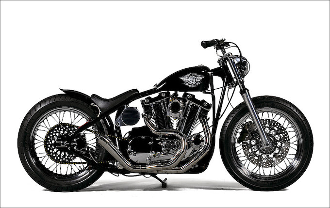「走行性能を損なわない範疇で、コンパクトで低いスタイルを目指してスピード感を演出した」とは製作者の弁。ご覧の1977XLHは、新進気鋭のカスタムショップ、新潟県魚沼市のグランドワークからの初出展車両である。コンパクトなタンクは左右分割式で左サイドはオイルタンクとなっている。ゆえにシート下にはスペースが生まれ、エンジンの存在感が浮き彫りになっている。マフラー形状など、各ディテイルも見所となっている。