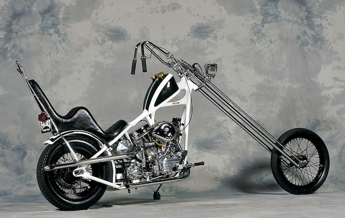 排気量1450ccまでボアアップされた1958年式のパンヘッドモーターを搭載したホットなロングフォークチョッパーである。製作を手掛けたのは千葉正樹率いるフリークス。コンセプトはズバリ「70s」だという。ナローなフロントエンドと丁寧なモールディングにより実現したスムースなフレームのアウトラインに注目していただきたい。ホワイトをベースにグリーンで引き締めたペイントもいい雰囲気である。オーナー/岩井光輝