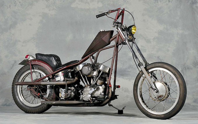 ハーレー専門のパーツディストリビューター、ガッツクロームのブースに展示されたデモバイク。49年式FLがベースであるが、「細く長く、かつ都内の渋滞でもスリ抜けができるチョッパー」をコンセプトに、東京のチェリーズカンパニーの手により製作されている。錆風のちぢみ塗装はジーンチョッパーズが担当。ガッツクロームのオリジナルブランド、AUTHENTIC MARKETのパーツもふんだんに取り入れられている。オーナー/貞方良祐