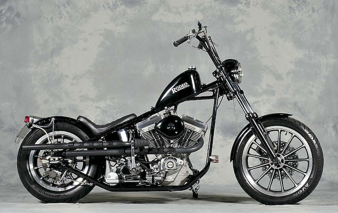 ロデオのコンプリートカスタム、Frisco EVO 1340cc。同店の定番モデルであるフリスコのS&S製EVOモーター搭載モデルである。ストレートライザー&ドラッグバーとハイマウントステップでコンパクトかつタイトなポジションと軽快な走りを実現。ブラックで統一されたエクステリアとマフラー、エアクリーナーでうまく落ち着いた雰囲気を演出している。飽きのこない定番のスタイルと言えるだろう。オーナー/新井正人