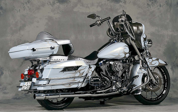 アトラクトが手掛けた2008年式FLHTCベースのバガースタイルカスタムである。クリーンな印象のホワイトパールにシルバーのトライバルフレイムスがエクステリア全面に描かれている。インナーフェアリングとシートサイドは落ち着いたガンメタリックシルバーで統一。薄型のH-D純正P&Aのレーザーパックラゲッジを装着し、ストックモデルとは明かに違い、リアエンドをスタイリッシュに演出している。オーナー/山本文彦
