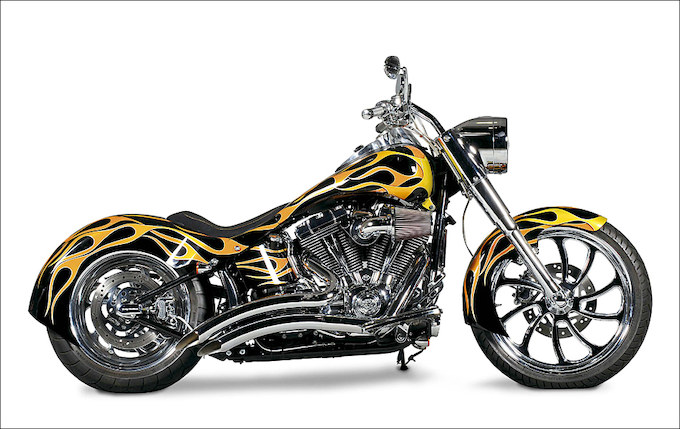 均整の取れたラインが見所となる2009ファットボーイ。フロントフェンダーにフューエルタンク、オイルタンクやリアフェンダーに至るまで妥協なく製作されている。オレンジ×イエローのフレイムスがマシン全体に躍動感を与えているのが、この写真からもお分かりいただけるだろう。高度な鈑金技術により生み出されたエクステリアなど、バッドランドならではの緻密なアプローチにより製作されたハイエンドカスタムマシンの登場である。