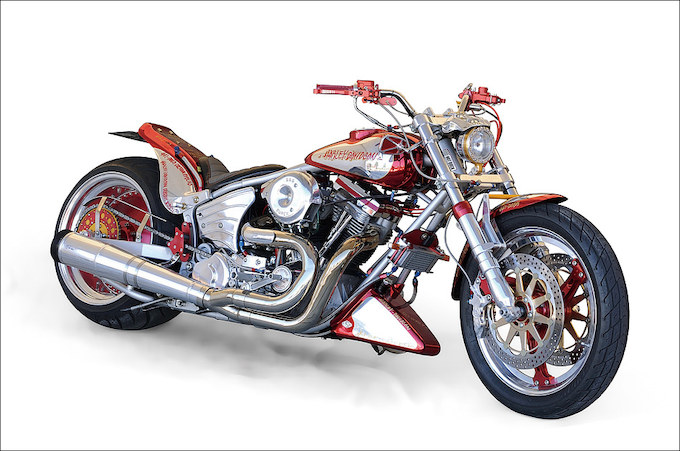 マフラーやアルミのエクステリア、フロントエンドなどホットドックのオリジナルパーツで武装した1991年式のFLSTF。もはやベースモデルの面影はどこにも見当たらない。EVOモーターはホットドックの手により106ciまでホップアップされ、ワイルドなルックスに見合うポテンシャルが与えられている。そしてクローム×キャンディレッドのカラーリングでフィニッシュ! オーナー/神島直