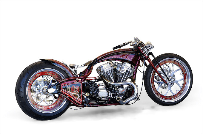 カスタムファクトリーBBのビルダー平田氏渾身の一台で、「これぞ BBの一台!」と呼ぶべきオリジナルのスタイリングが与えられている。複雑なアールで構成された低く身構えるドロップダウンフレーム。そのラインとシンクロするワンオフエクステリア。サクラをイメージさせる前後のビレットホイールに緻密なペイントワークなどなど、正しく世界レベルのハイエンドカスタムの登場だ。