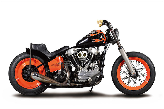 2007HCSに出展し、40年代ホイールキャップやS&Sツースロートなど改良を加えた46FL。F16/R15の変則タイヤサイズを最も美しく見せるべく、骨格をショートレングスフレームにモディファイ。そしてパンヘッドのサイドカー用トリプルツリーを極限までナロード。これによりタイヤ幅ギリギリのクリアランスからなる圧巻のフロントビューを形成。タンクはサイドカーモデルG用をチョップ。オーナー/OHTA