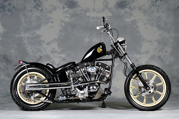 「純正パーツのリビルドと汎用パーツでいかに格好良く出来るか」がテーマの一台である。ブラックを基調に70’S CHOPPERに仕上げた79ショベル。ハイライザー&スーパーバー、スポーツタンク、フラットフェンダーの黄金比的パーツチョイスにミッドハイのポーカーパイプでアグレッシブなテイストを加えている。前後ゴールドキャストがアクセントだ。オーナー/畑 昌勝