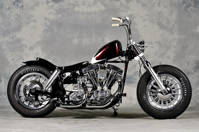 1979年式ショベルFLHをベースに、前後16インチの純正キャストホイールを履かせ、コンパクトかつワイルドなイメージに仕上がった一台。リアサスペンションを装備する4速フレームの長所を生かしてマッシブな雰囲気をうまく演出している。手曲げ風のストレートパイプはワンオフ。シックなツヤのあるペイントとエナメルシートの質感がマッチしている。ホワイトカラーに彩られたトリプルツリーとライザーもアクセントとなっている。オーナー/阪本匡誉