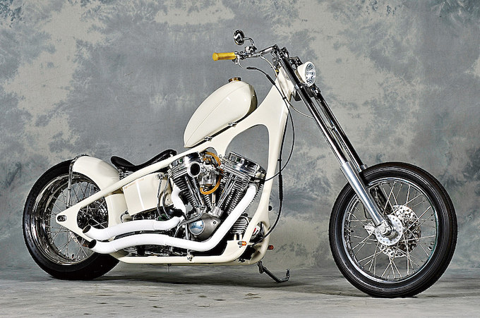 「逆グースネックもありじゃないか」という大胆な逆転の発想から、あえてバランスの悪そうなフレーム形状に挑んだというエッジモーターサイクルの意欲作。徹底的にこだわった白いカラーリングから “スワンネック” と命名された。ビルダー曰く「バランス良く仕上がったと思います」。90年式のエボリューションモーター搭載で、走行性能は意外なほどニュートラル。極限までハイマウントされたフューエルタンクのマウント方法にも、ぜひ注目していただきたい。