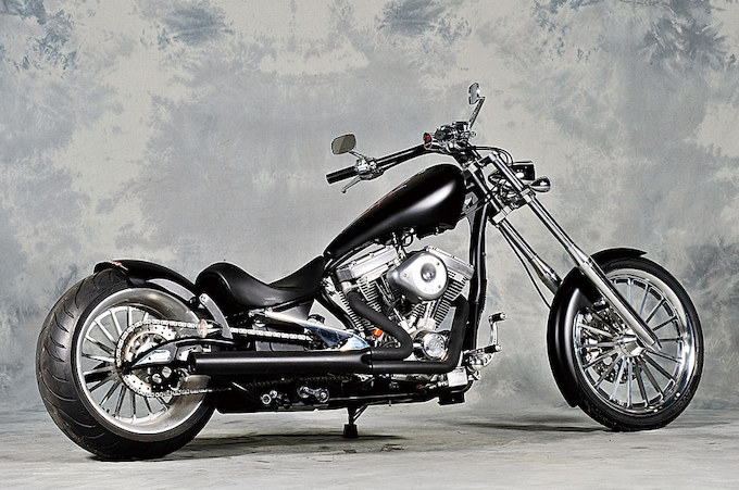 ビッグベアチョッパーズのフレームを使用し、日本人の体型に合うようモトブルーズがコントロール類をセットアップしたカスタムマシン。S&Sの100インチスムースモーター+ベーカー製6速ミッションをコンプリートし、全身をブラックアウト。コンセプトは「低く、太く、悪い 」という新作チョッパー。このグラマラスなスタイリングがポイントである。もちろんこのモデルをベースに、さまざまなカスタムオーダーも可能。世界で一台のカスタムハーレーも夢ではない。