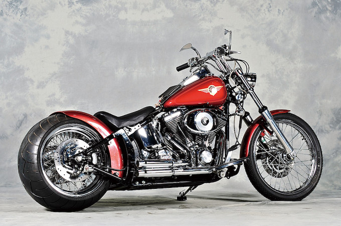 国産のシングル/ツインからハーレーまでをベースにさまざまなスタイルのカスタムからワンオフパーツ製作まで行う兵庫県のダイナオート・インダストリーズ。ノーマルの面影を強く残すボディに300タイヤという超ワイドなリアホイールを装着。しかもスポークホイールである。そのワイドタイヤにピタリと沿ったサイクルフェンダーもリアエンドの見所である。一点豪華主義のカスタムで車両を魅せるというシンプルな技法が用いられたマシンと言えるだろう。