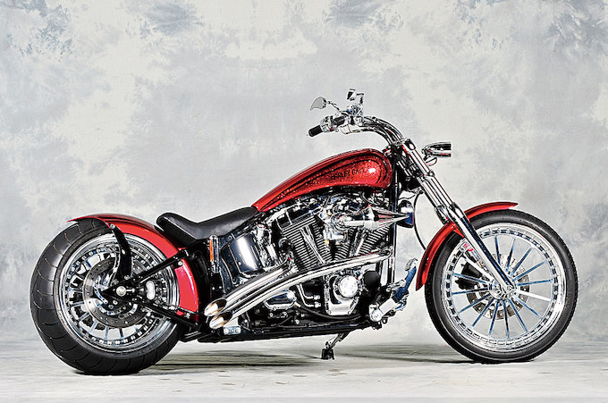 300サイズのワイドリアタイヤを履いたツインカムのソフテイル。前後のビレットホイールをはじめ、要所にハイエンドパーツを多用するフルカスタムである。ストレッチされたボリュームのあるフューエルタンクにシャープなリアフェンダー。煌びやかなフレークペイントも大きな見せ場となっている。3次チェーンによるファイナルドライブを使用するリアワイドキットは、オリジナルパーツとしてダイナオートからEVO/TC用がキット化される予定だという。