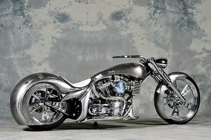 1.2mm厚の鉄板を用いて気の遠くなるようなシートメタルで生み出された有機的なエクステリアが見せ場となるこちらの車両。関西ニュースクールカスタムの雄、トライジャが持ち込んだ一台である。2010年式のFXSTがベースに作られたこのカスタムは、製作者によりPHLOXと命名された。各所に配された欧州メイドのビレットパーツにも注目していただきたい。そして、この迫力のスタイリング。もはやアートの域に到達していると言える。オーナー/花井
