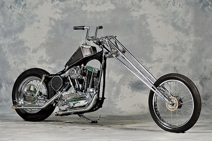 アンフィニッシュのモデルでありながらもサイケデリックなセブンティーズチョッパーの片鱗を垣間見せる京都のトロージャンサイクルが持ち込んだこちらの一台。スラリと前方に伸びたガーターフォークやエッジが際立つコフィンタンク、オクタゴンタイプのオイルタンク、さらにライザーを介したZバーなどワンメイクされたディテイルも見応え満点。クロームメッキが施されたモーターもセブンティーズの雰囲気を醸す。ビルダーは米国人クライン・クリスチャンとのこと。