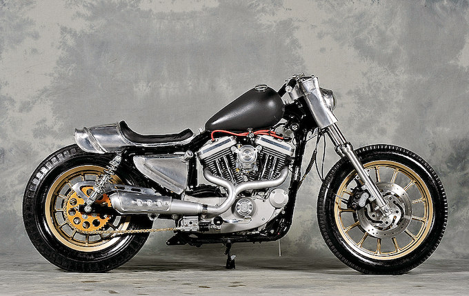 鹿児島市でスワローテイルを営む桜井夏樹がエントリーさせた2000年式のXL1200S。基本骨格はそのままにアルミ板を叩き出したワンメイクのエクステリアに換装、往年のレーサーのテイストでフィニッシュされている。ハンドメイドクリエイションを信条とするスワローテイル特有の暖かみのある車両に仕上げられている。ゴールドカラーのキャストホイールが、ソリッドカラーの車体に一際映えるマシンと言える。
