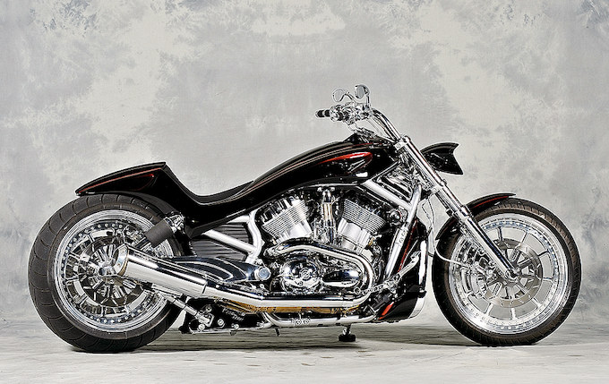 ショップオーナーがヨーロッパのショーで一目惚れしたという、タンクカバーからシートカウルまでが一体となったJACK LOMAXX製のFRPボディーKITを装着し、リアタイヤをワイド化した2008年式のVロッド。これまでのVロッドベースのカスタムの概念を覆すほどの大きなインパクトを秘めている。ちなみに、今回のニューオーダーでは唯一のVロッドカスタムだったが、この圧倒的な存在感は見応え十分であった。
