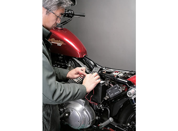 スポーツスターのバッテリーは密封式・補水不要のメンテナンスフリータイプなので、電圧を測定することでコンディションを判断する。スペック上では直流12Vとなっているが、使用状況によって実際の電圧は上下するからだ。