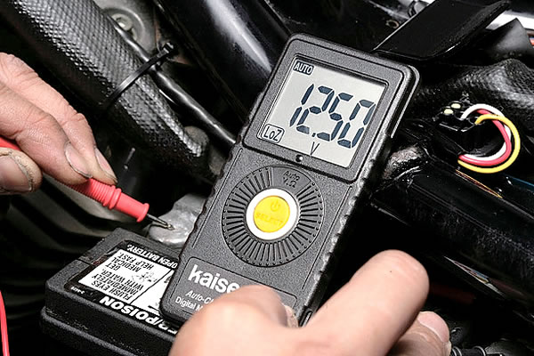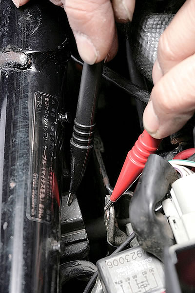 ヘッドライトやウインカーなどの燈火類を作動させるだけでなく、スパークプラグに火を飛ばすためにもバッテリーが必要。ガソリン残量やオイル量と違い、外から見ただけでは充電されているかどうか分からないバッテリーの状態を知るには、サーキットテスターを用いる。使い方は簡単なので是非活用したい。