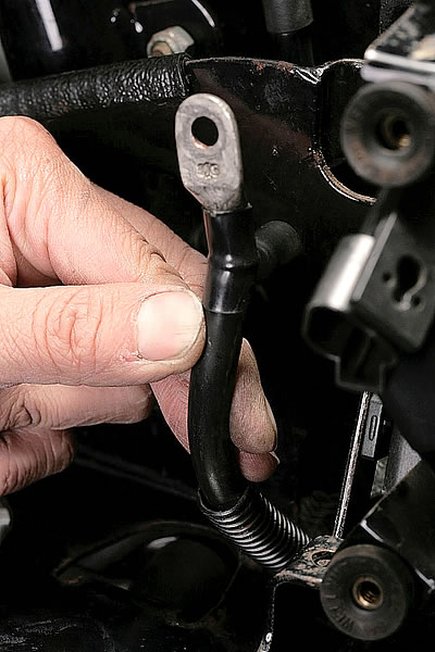 プラスケーブルはセルスターターに、マイナスケーブルはフレームに取り付けられている。太い分だけ柔軟性がないので、端子部分の折損や割れなどがないことを確認する。