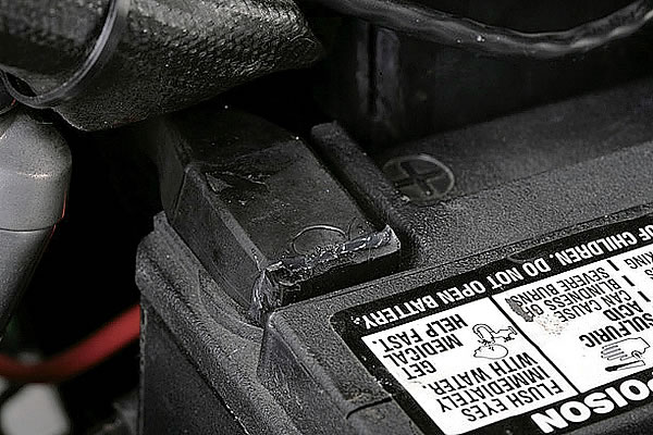 プラス、マイナスのケーブルを外してバッテリーを取り外す。端子周辺に白い析出物が固まっていないか、本体にクラックがないかを確認する。ちなみに排気チューブは存在しない。