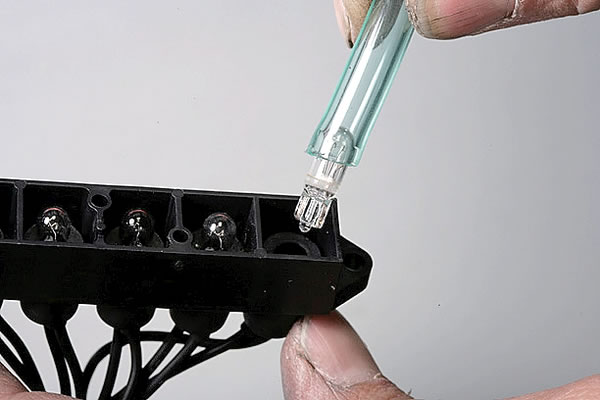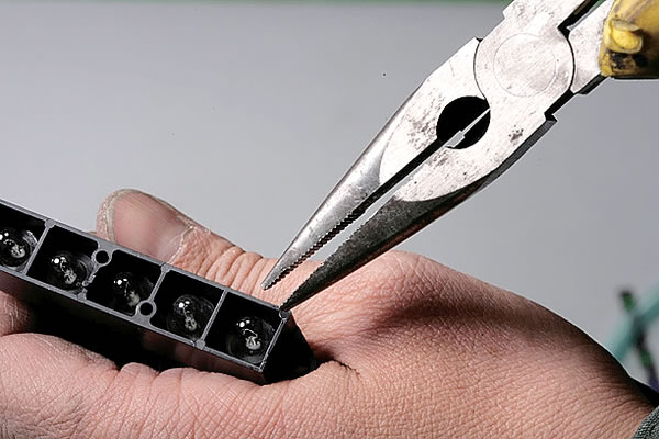 これがインジケーターランプハウジング。見ての通り各部屋ともウェッジ球がぴったり収まるサイズで、金具付き電球ではありえないスりムさだ。しかしながら指が入らない。