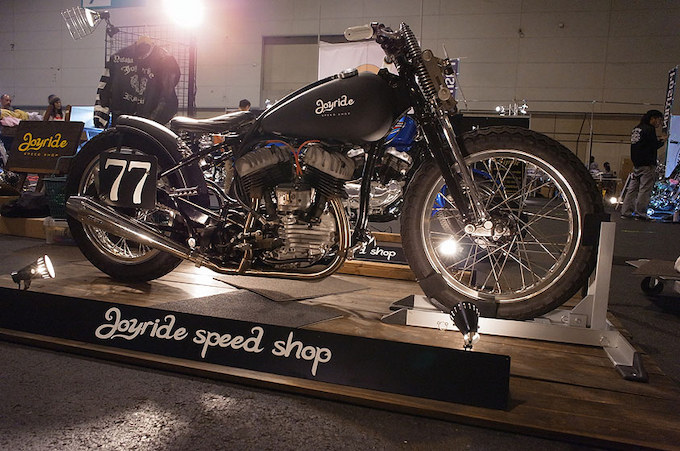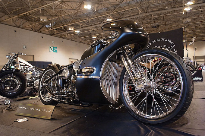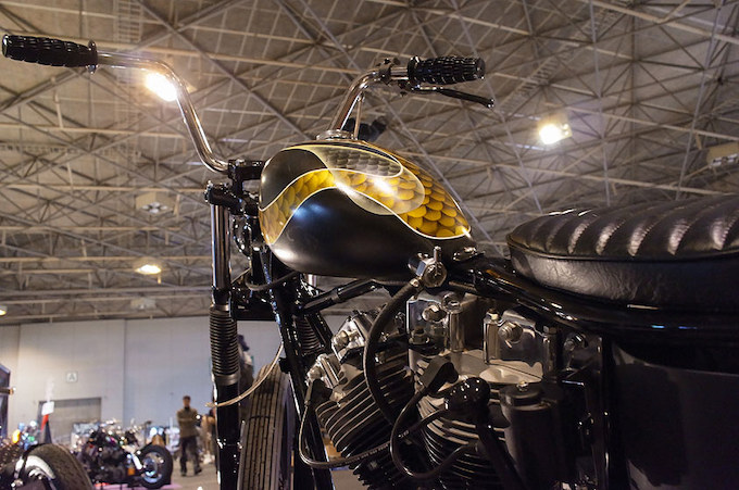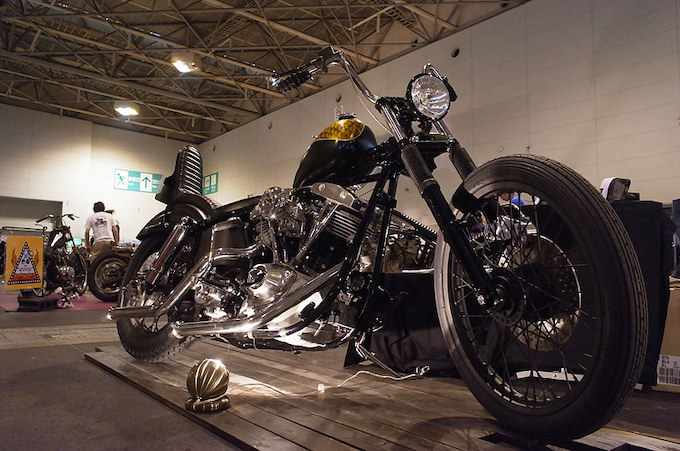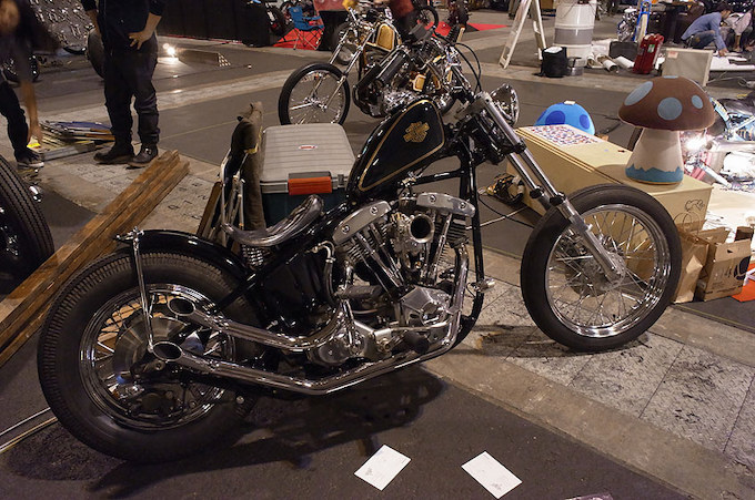 NIHIRU CUSTOM CYCLEが展示したロードスターテイストのショベルカスタム。マットブラックのカラーと相まって只ならぬ雰囲気を醸し出している。