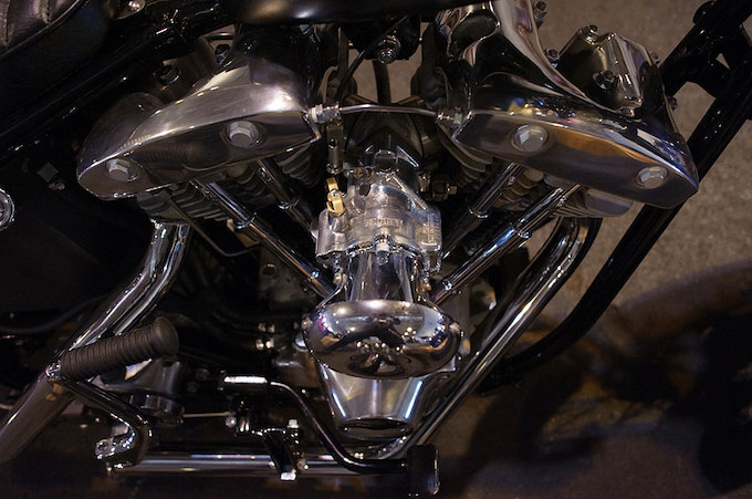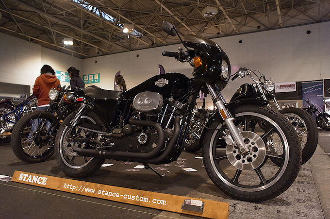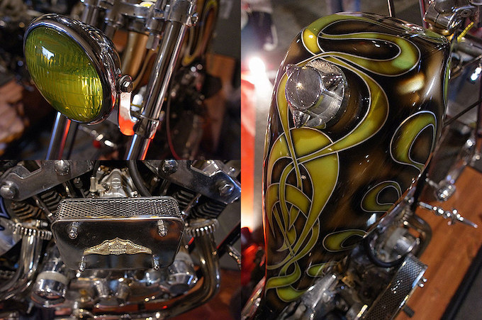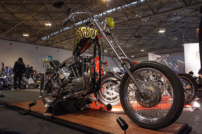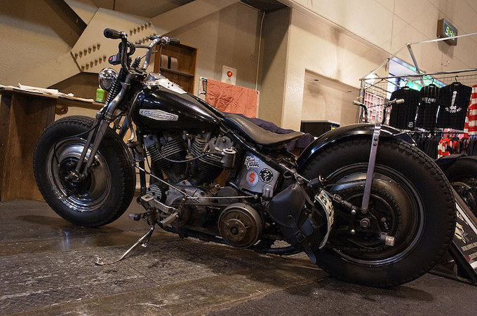 同じくSTANCEが手掛けたショベルチョッパー。ターンアウトのアップスイープマフラーがいい雰囲気である。